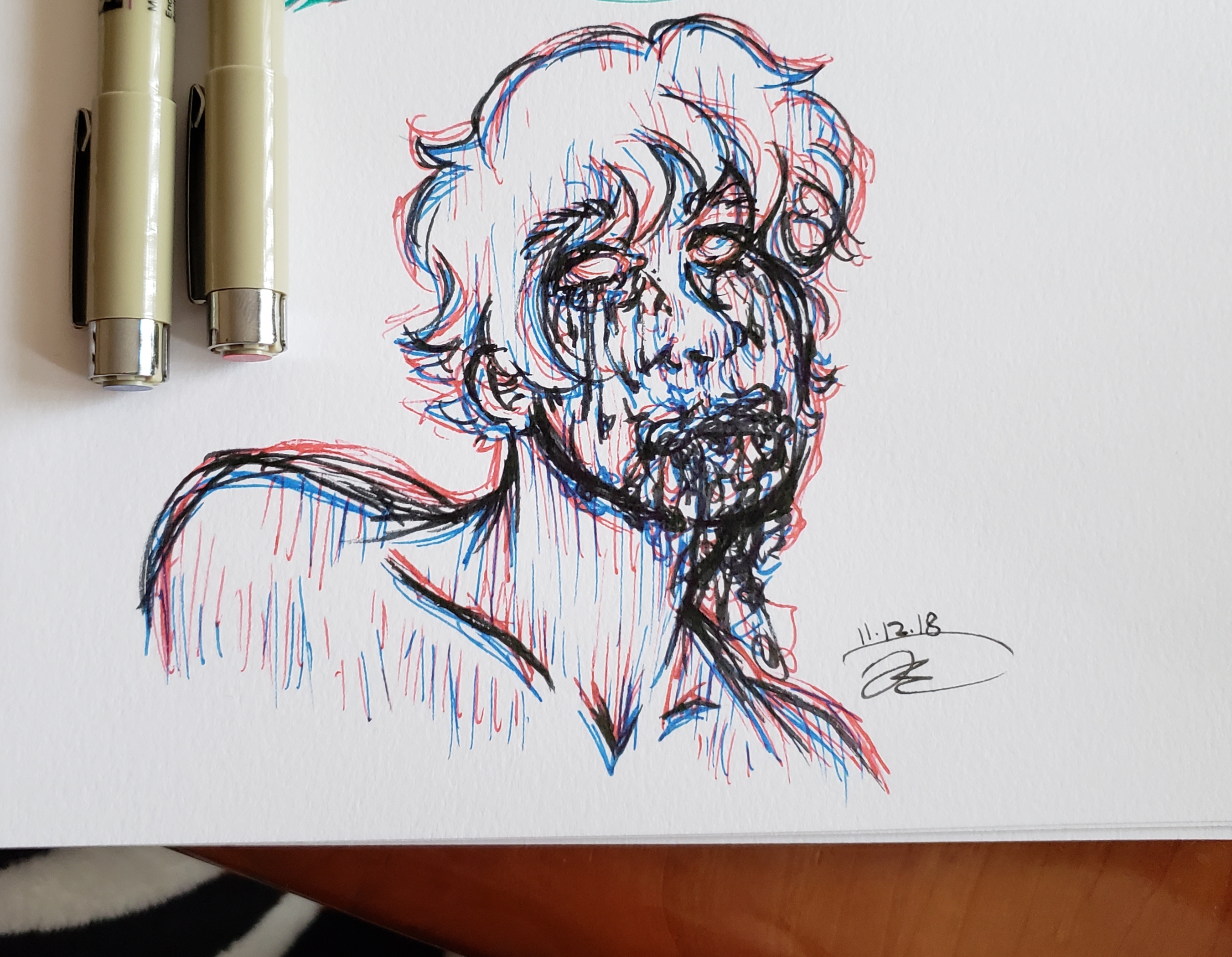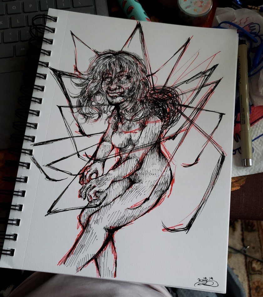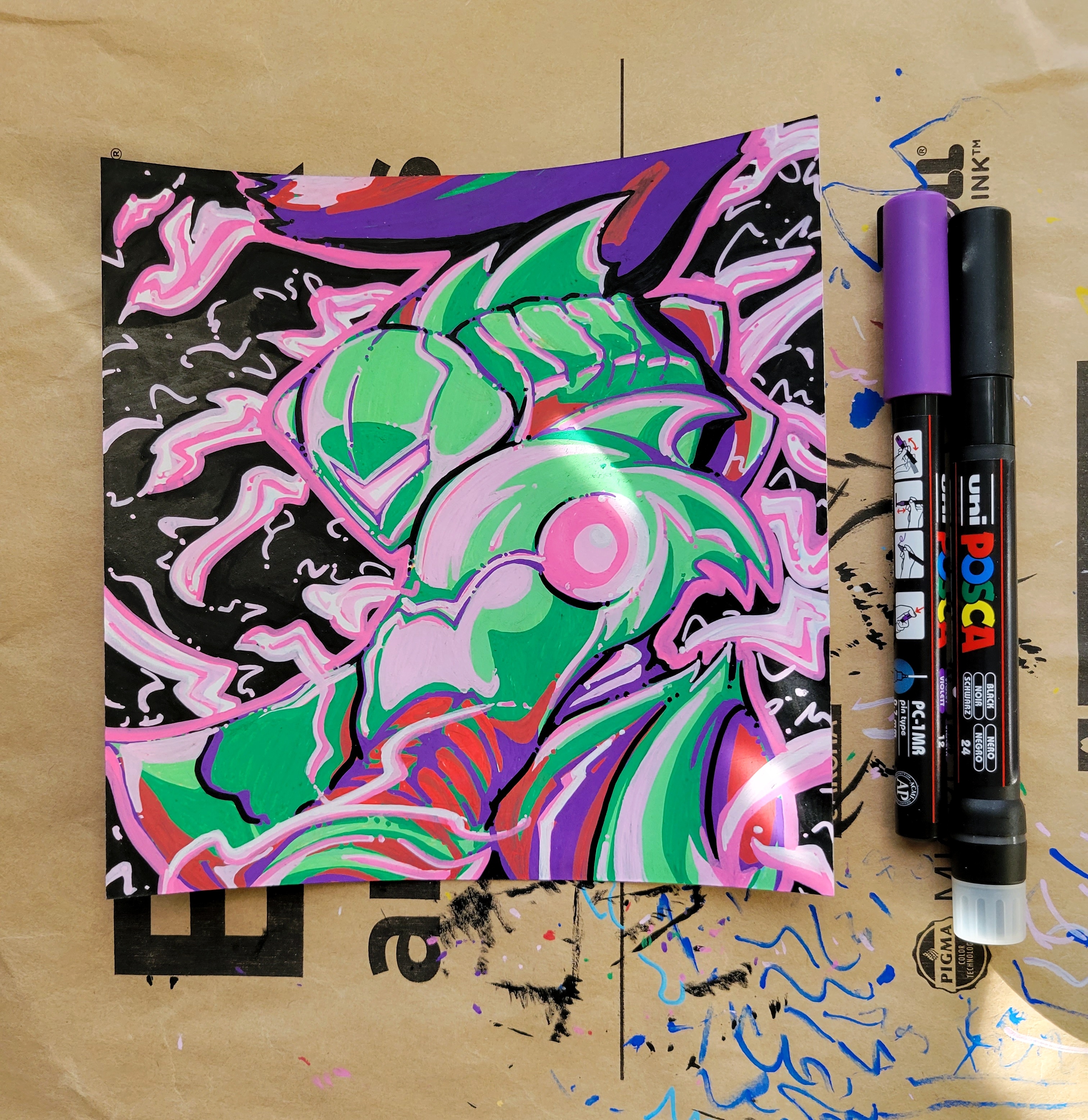 traditional artwork utilizing pen, paint, pencil, and marker.